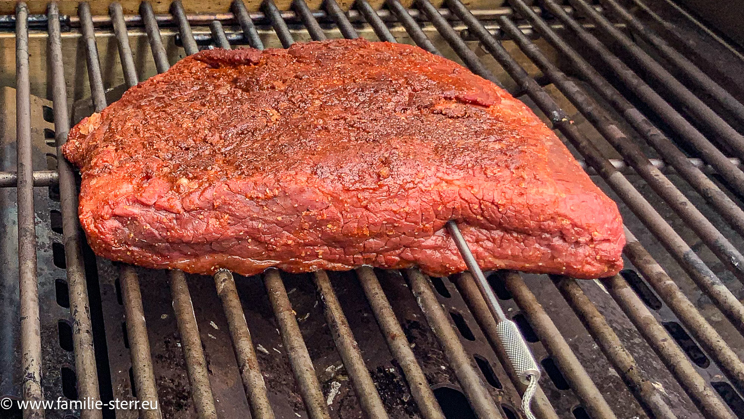 Dafür waren wir gestern beim Metzger unseres Vertrauens, Thomas (praktische Namensgleichheit mit dem Metzgermeister) hat unseren Plan aber etwas durcheinander gebracht und uns ein unwiderstehliches Stück Rinderbrust für ein Pastrami gezeigt. Also musste natürlich der Grill sofort angeworfen werden, um das Stück langsam zu räuchern.