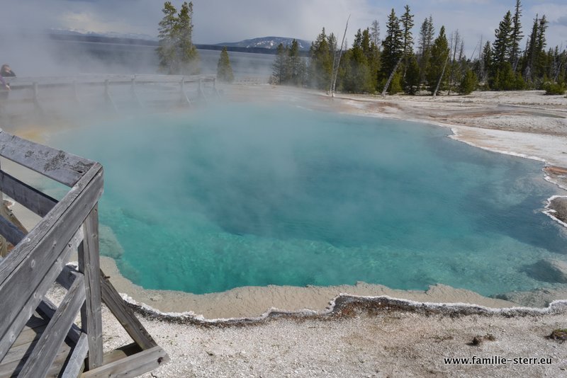 Als einen der letzten besonderen Bereiche im Nationalpark besuchten wir an unserem >>> zweiten Tag im Yellowstone das West Thumb Geiser Basin, einer Ansammlung von heißen Quellen direkt am Ufer des Yellowstone Lake. Auch hier war neben den optischen Reizen vor allem die Geräuschkulisse beeindruckend. Überall hört man es brodeln und zischen, hört den heißen Dampf entweichen und das Kochen des Wassers in den Quellen.